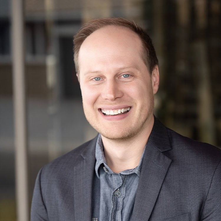 A smiling man with brown hair looks at the camera, wearing a blue blazer and light V-neck shirt, indoors before a large window showing blurred green and yellow foliage.