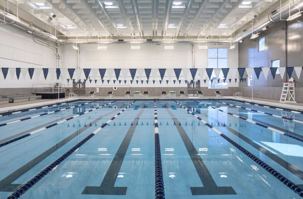 Indoor lap pool with calm, lane-separated water; starting blocks, lifeguard chairs, and triangular lane flags hang beneath a high, grid-patterned ceiling in a bright aquatic center.
